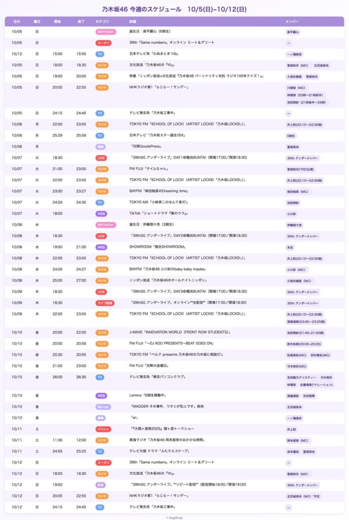 10/05(日)〜10/12(日)の乃木坂スケジュールまとめ